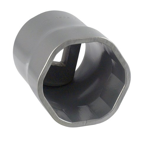 This socket has a 3/4 square drive opening, permitting the use of an extension and torque wrench to tighten the locknut as required. Locknut removal and installation is simple, even when wide-rim wheels are involved, since a long extension may be attached to the socket to provide the necessary clearance.